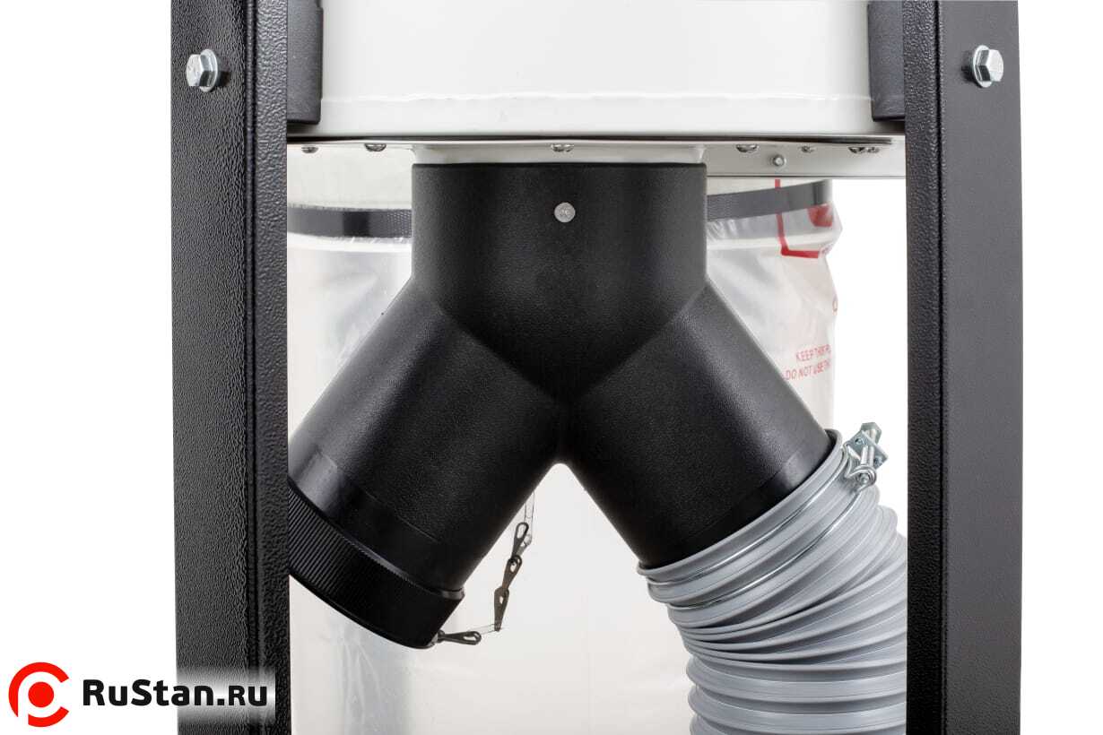 Одно из достоинств этой модели – разветвитель аспирационного патрубка для одновременного подключения двух 100-миллиметровых рукавов (они могут идти к нескольким точкам одного станка или к нескольким станкам в зависимости от необходимости). При работе с одним станком необходимо закрыть свободный патрубок, для этого предусмотрена заглушка.