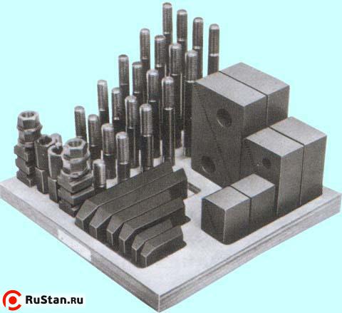 Набор предназначен для фиксации заготовок, деталей сложной формы при дальнейшей обработке на фрезерных, сверлильных и других станках , имеющих ширину паза 11.7-12мм на столе. В набор клиновых прижимов входят: Сухари (резьба М10х1,5) для станочных пазов 11.7мм - 6 шт. Гайка М10х1,5 с буртиком - 4 шт. Гайка М10х1,5 высокая - 4 шт. Клиновые опоры с рифлением - 6 шт. Прихват плоский с рифлением - 6 шт. Шпильки М10х1,5 длиной 75 мм - 4 шт. Шпильки М10х1,5 длиной 100 мм - 4 шт. Шпильки М10х1,5 длиной 125 мм - 4 шт. Шпильки М10х1,5 длиной 150 мм - 4 шт. Шпильки М10х1,5 длиной 175 мм - 4 шт. Шпильки М10х1,5 длиной 200 мм - 4 шт. Для удобства работы набор располагается на открытой деревянной подставке.