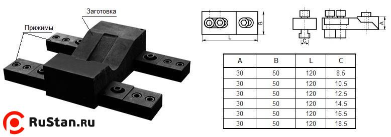 Предназначен для регулировки базирования и фиксации заготовок (деталей), имеющих плоское основание, для дальнейшей обработки на фрезерных, сверлильных и других станках , имеющих ширину паза 13.7мм на столе. Изготавливается из стали 45 с оксидированием, HRC 30-40. Рекомендуется использовать парами.