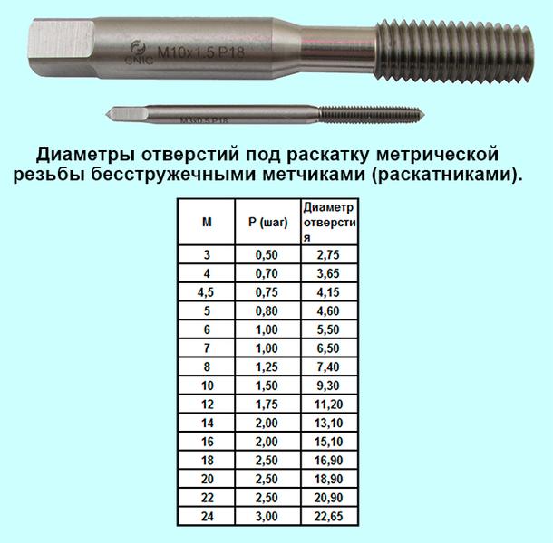 Раскатка бесстружечными метчиками (раскатниками) - холодная формовка. Применяется для получения (с высокой производительностью) резьбы в пластичных материалах таких, как алюминий, медь, сталь Ст2, Ст3 и в специальных марках сталей для холодной штамповки.