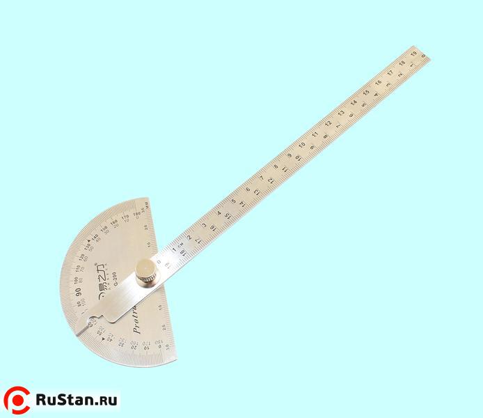 Применяется при построении и измерении углов на плоских поверхностях. Состоит из полукруглой пластины со шкалой, разбитой на градусы, соединенной с опорной планкой, в которой есть прорезь со стрелкой-указателем. Для измерения контактным методом опорной планкой транспортир прикладывается к одной из сторон угла детали, а ко второй стороне угла прикладывают прямую сторону пластины. Угол определяется в градусах по шкале. Толщина 1,2мм.