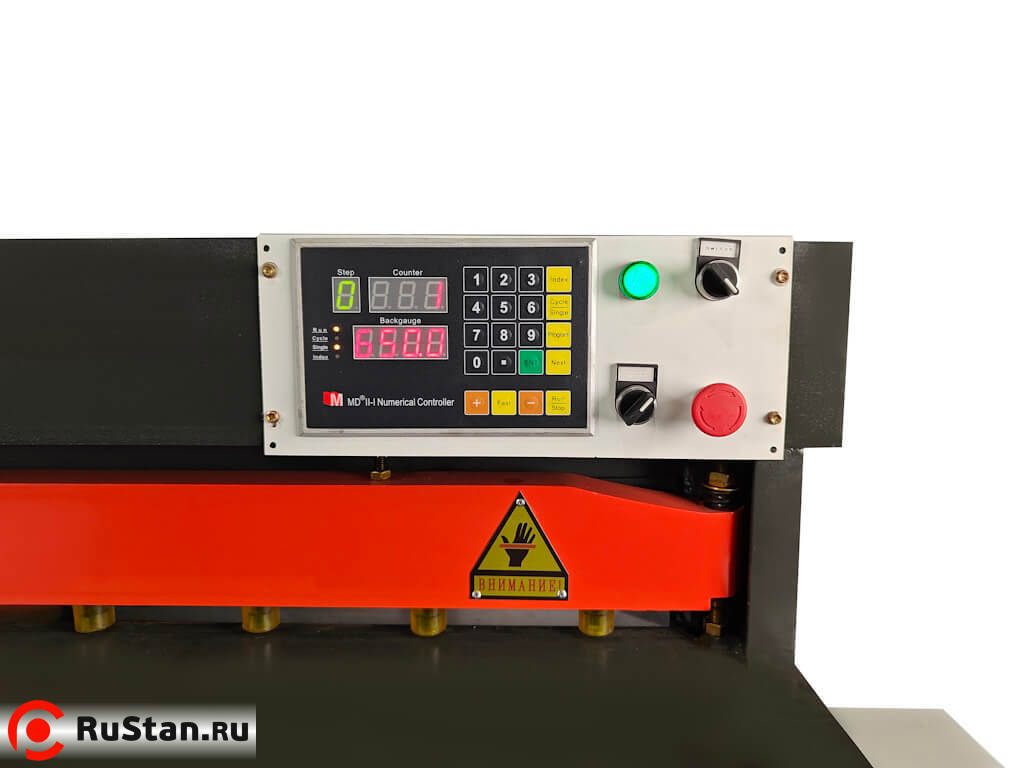 • Управление перемещением заднего упора осуществляется числовым контроллером MD11-1. Данный контроллер обладает интуитивно понятным интерфейсом, также на панели контроллера расположен тумблер включения-выключения, световой индикатор питания и грибок аварийного выключения.