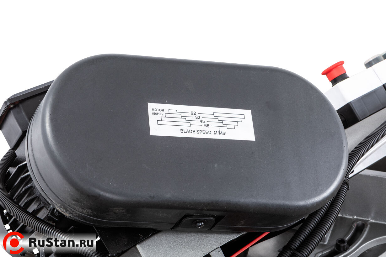 Ременная передача позволяет осуществлять смену скорости движения ленточного полотна. Станок может выполнять распил заготовок в четырех режимах скорости движения полотна 22, 33, 45 и 65 м/мин. Включение двигателя осуществляется через блок управления.