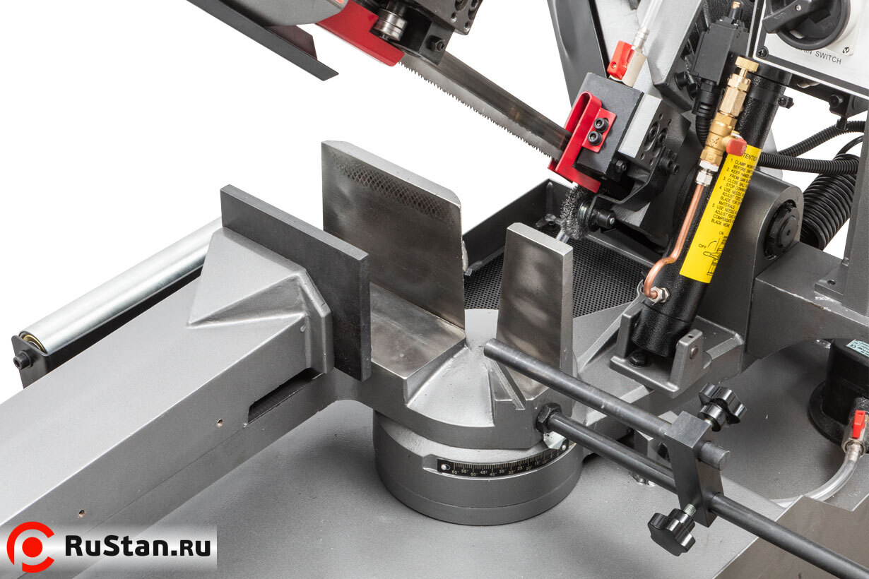 Ленточнопильный станок оборудован быстрозажимными тисками, используя которые можно добиться высокой производительности работ. Консоль станка имеет направляющие, передвижение которых позволяет регулировать проход ленточного полотна, повысить качество распила и ограничить уводку полотна в сторону. Направляющие оснащены подшипниками, выполняющими функцию позиционирования ленточного полотна в вертикальном положении относительно обрабатываемой заготовки. Станок имеет тензометр, фиксирующий силу натяжения ленточного полотна. Регулировка силы натяжения осуществляется вручную.