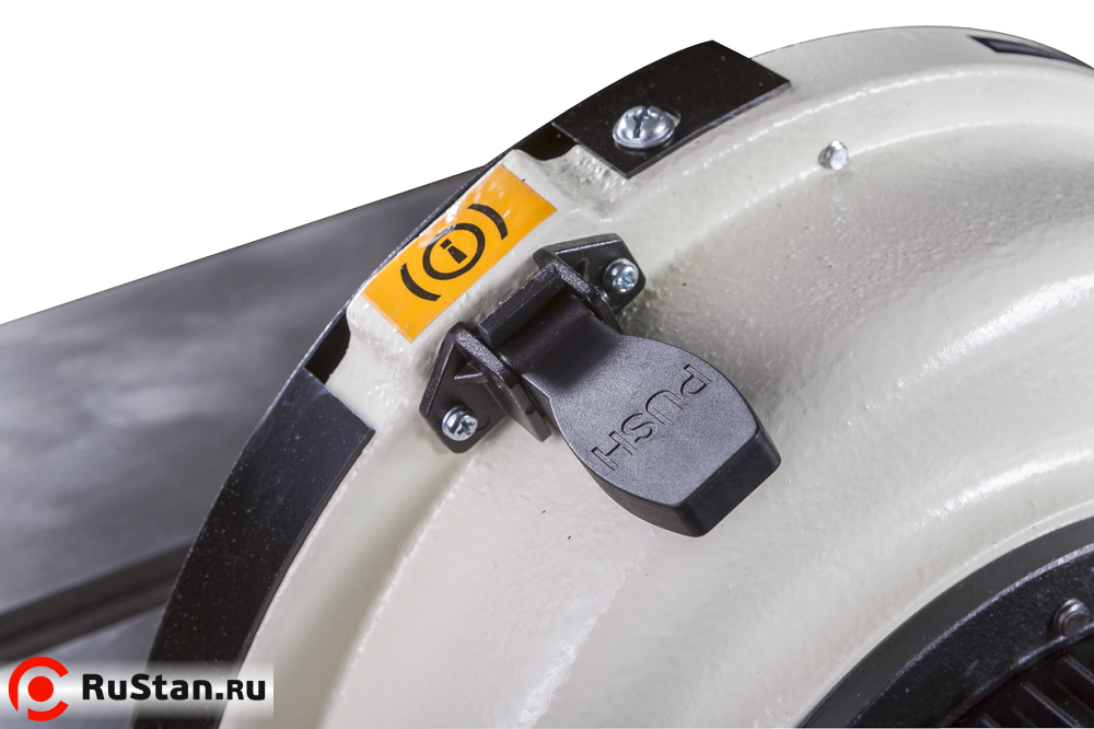 Массивный рабочий стол выполнен из чугуна, оборудован двумя перпендикулярными пазами для работы с упором или устройством шлифования по кругу. Встроенный вентилятор удаляет пыль из рабочей зоны даже без подключения к внешней вытяжной установке.