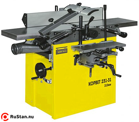 Комбинированный строгальный станок модели «Корвет-231-31» предназначен для индивидуального использования для строгания (фугования) поверхностей заготовок с помощью вращающегося в горизонтальной плоскости строгального вала, расположенного между двумя столами, используемыми как опора для обрабатываемой заготовки из древесины. Строганию подвергается нижняя или верхняя поверхности заготовки. При использовании нижнего стола производится строгание одной или последовательно нескольких заготовок в определённый размер по толщине (рейсмус). При использовании суппорта производится ряд сверлильных и фрезерных операций – выборка пазов и гнезд для мебельных соединений.