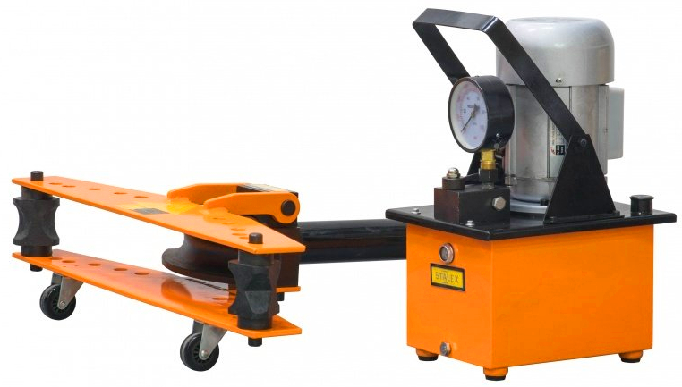 Электромеханический - более мощный и точный инструмент для труб. При их использовании усилия работника сводятся к минимуму – он производит лишь установку настроек и смену заготовок. Модель Stalex ЕHB-10 продавливает заготовки при помощи гидравлической направляющей, с шестью сменными рабочими опорами. Помимо шести горизонтальных опор станок имеет две вертикальные опоры, устанавливаемые в отверстия для регулировки радиуса гиба.