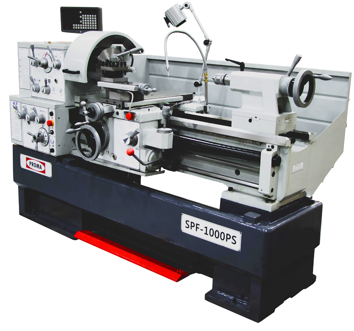 Универсальный токарный станок Proma SPD-1000P с УЦИ предназначен для обработки тел вращения путём снятия с них стружки при обточке. На станке можно выполнять различные виды токарной обработки: обтачивание цилиндрических, конических, фасонных поверхностей, подрезку торцов, отрезку, растачивание, а также сверление и развёртывание отверстий, нарезание резьбы и накатку рифлений, притирку и т.п. Модель оснащена ножным тормозом, лампой рабочего освещения и системой охлаждения СОЖ.